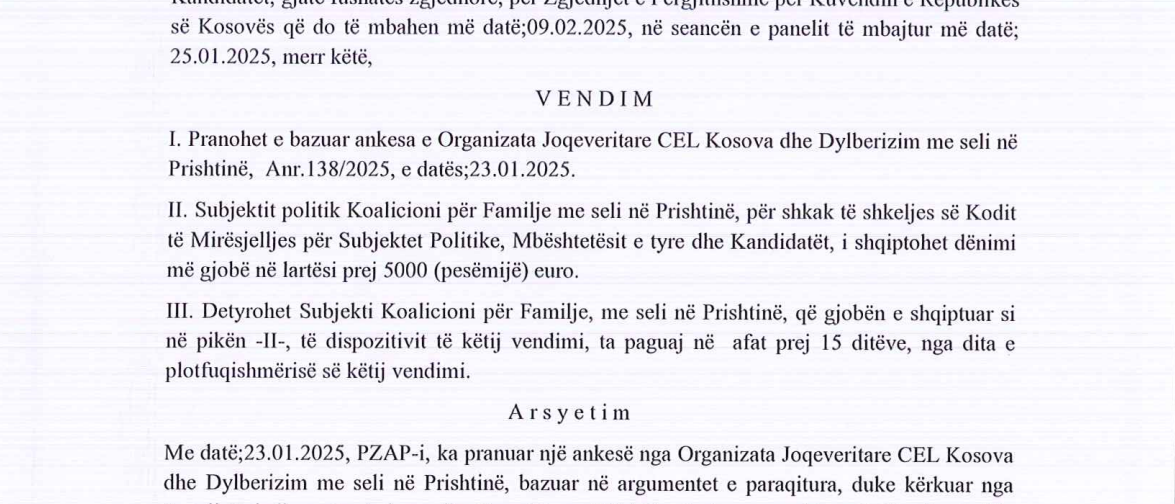 Pas ankesës së paraqitur nga Dylberizm dhe CEL Kosova kundër Koalicionit për Familje, për shkak të nxitjes dhe përdorimit të gjuhës së urrejtjes kundër dylberave, PZAP të shtunën i shqiptoi gjobë këtij subjekti politik në lartësi prej 5000 eurosh.